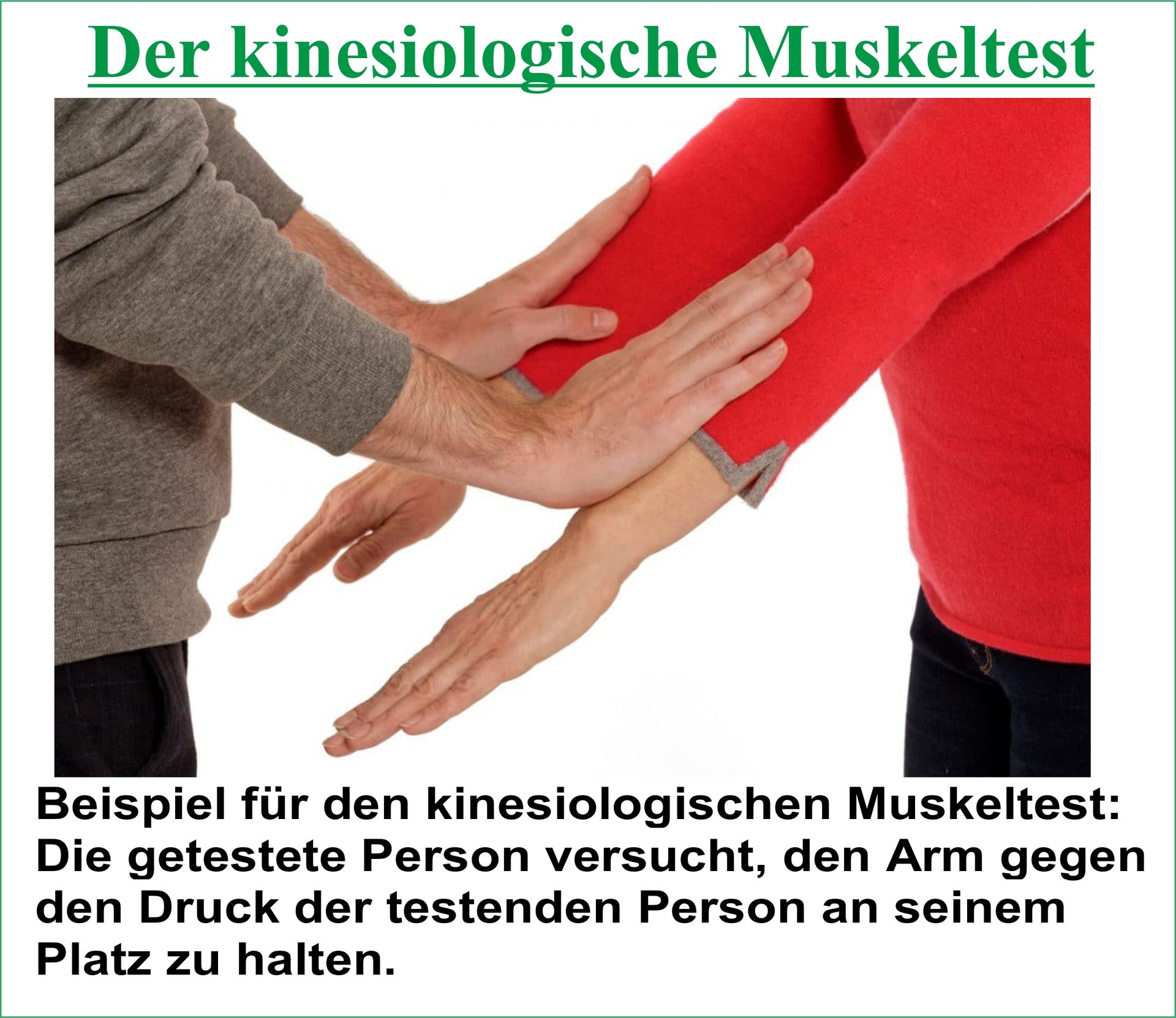 Beim Muskeltest wird die Energie getestet und nicht die Muskelkraft. Druck wird auf den isolierten Muskel mit bis zu ca. 1 kg. Gewicht ausgeübt. „Rastet“ der Muskel ein, so ist die Körperenergie im Fluss, gibt der Muskel nach, so erhalten wir dadurch vom Körper ganz direkt eine Information über eine Blockade des Energieflusses, über das Vorhandensein eines oder mehrerer Stressfaktoren und damit über ein Ungleichgewicht im System.