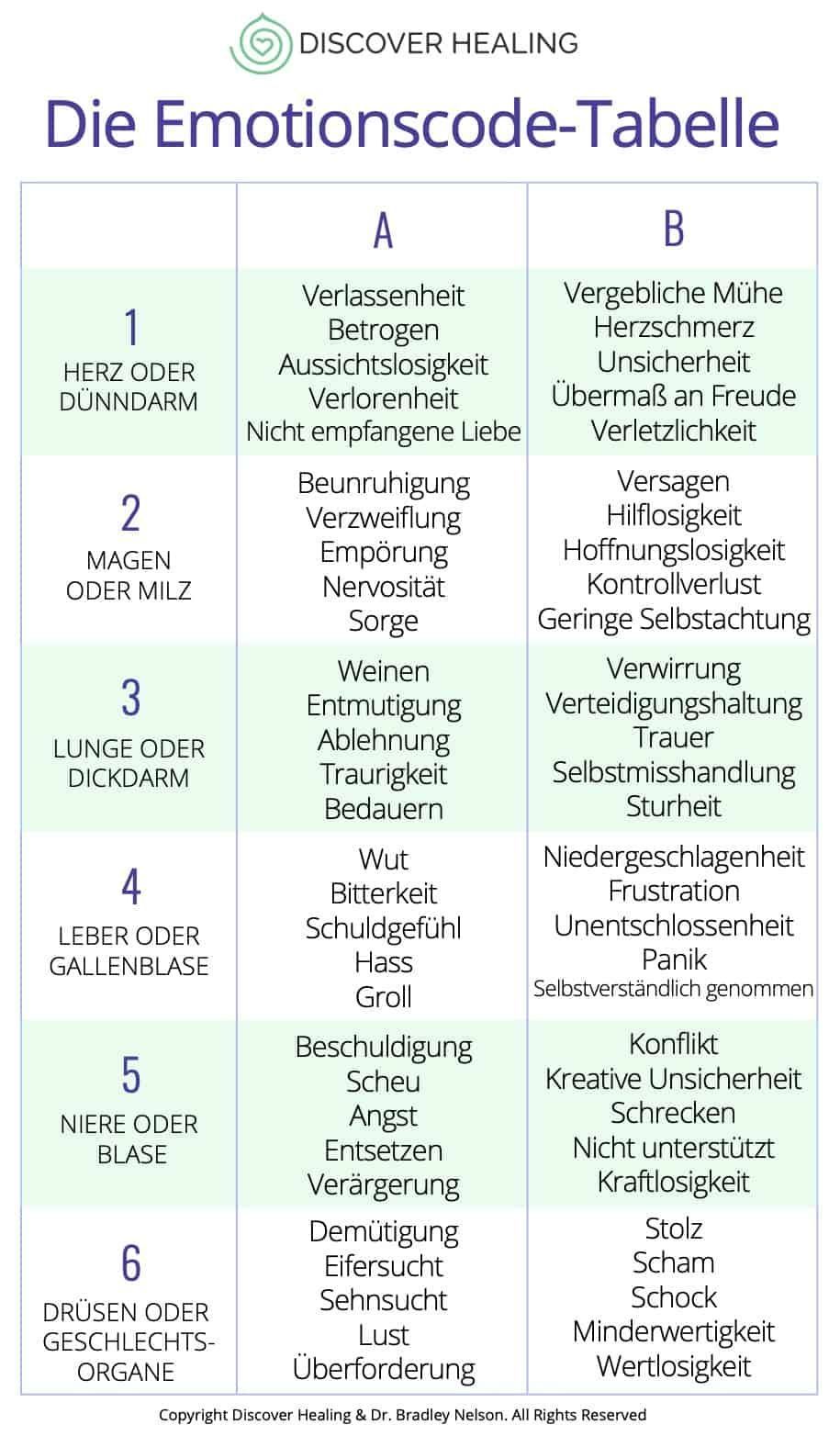EMOTIONSCODE ® Tabelle nach eingeschlossenen Emotionen oder negativen Glaubenssätzen.